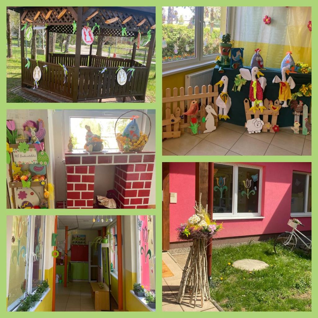 Jarné lúče slniečka konečne vykukli a všetko sa zazelenelo, ba zakvitli kvety nielen v tráve ale i na stromoch. Aj v exteriéri nášho areálu MŠ zakvitli vyvýšené záhony, skalka, či dekoračné ozdoby. A taktiež interiér škôlky zdobí krásna jarná výzdoba, vďaka šikovným p.učiteľkám.